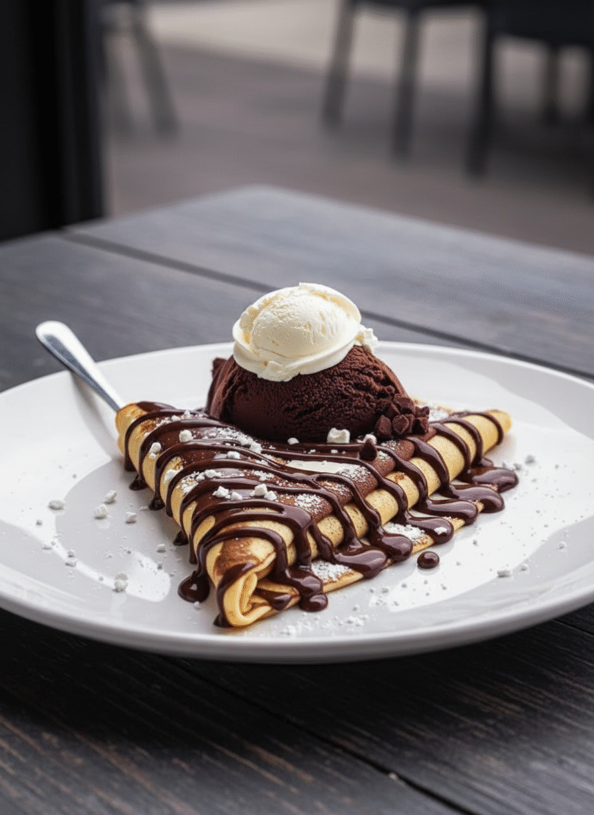 Indulge in delicate, buttery crepes layered with creamy ice cream and a luscious chocolate drizzle — the ultimate treat for…