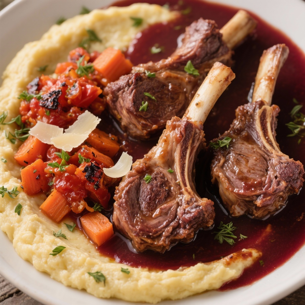 Tender, fall-off-the-bone lamb shanks slowly braised in a rich red wine sauce, paired with a smoky burnt tomato relish and a bed of creamy, herbed polenta. Each element complements the other: the lamb is hearty and flavorful, the relish adds brightness and depth, and the polenta ties it all together with buttery smoothness. This is comfort food elevated — perfect for a special dinner, a cozy weekend meal, or a dish to impress guests.
