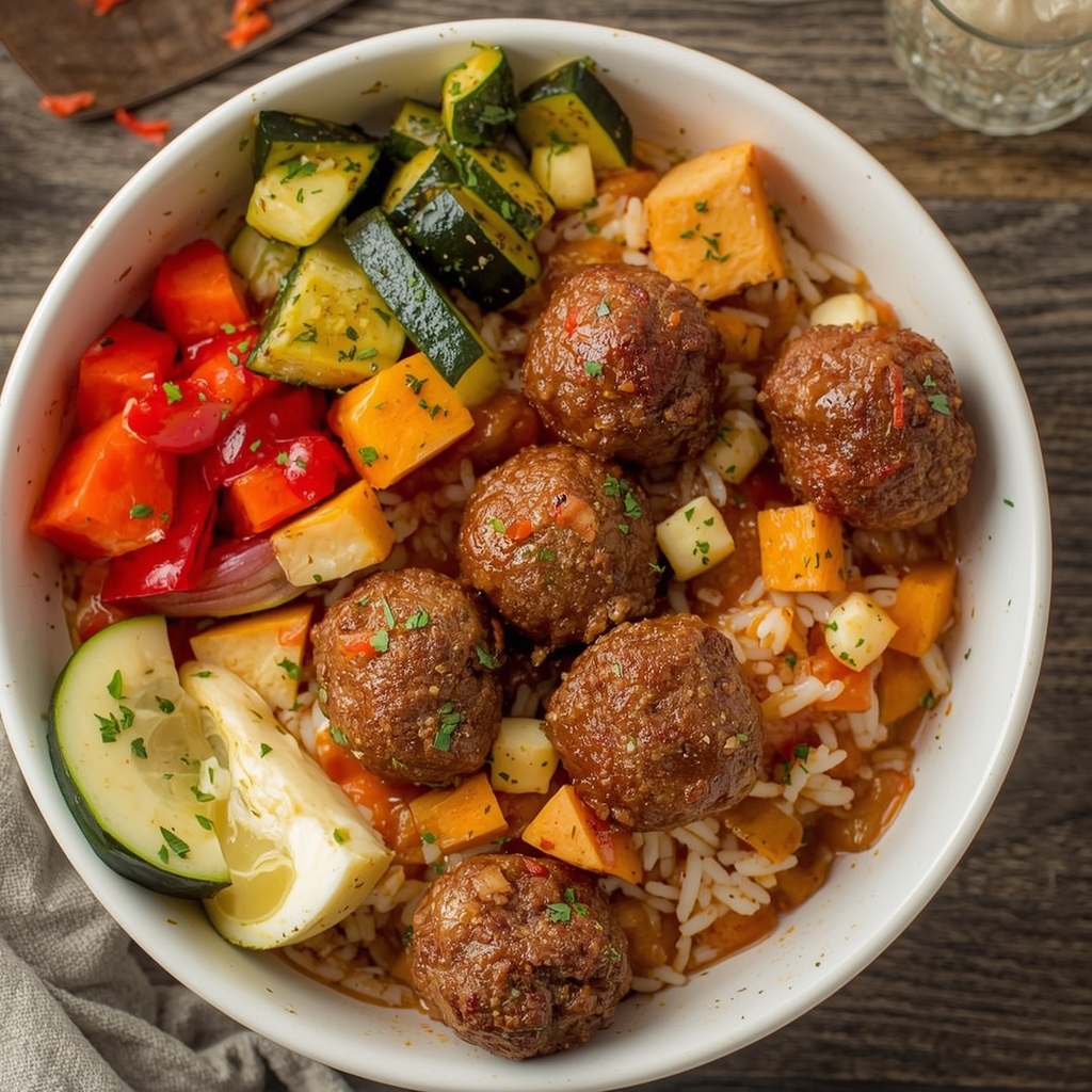 This Ultimate Meatball Bowl is the perfect balance of comfort and freshness. Juicy, well-seasoned meatballs bring rich, savory flavor, the herbed rice adds a light aromatic base, and the roasted veggies provide natural sweetness and color. It’s a complete, nourishing meal made from simple ingredients — ideal for weekly meal prep, family dinners, or healthy lunches that still feel indulgent. Everything cooks in under an hour and comes together beautifully in one hearty, satisfying bowl.
