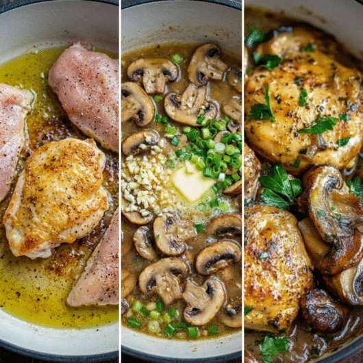 This quick and flavorful skillet mushroom chicken is the perfect weeknight dinner. Tender chicken cutlets are seared until golden, then finished in a savory mushroom and garlic pan sauce. The combination of herbs, green onions, and chicken broth creates a rich, comforting flavor without any heavy ingredients. Ready in just 20 minutes, it’s simple, wholesome, and incredibly satisfying.
