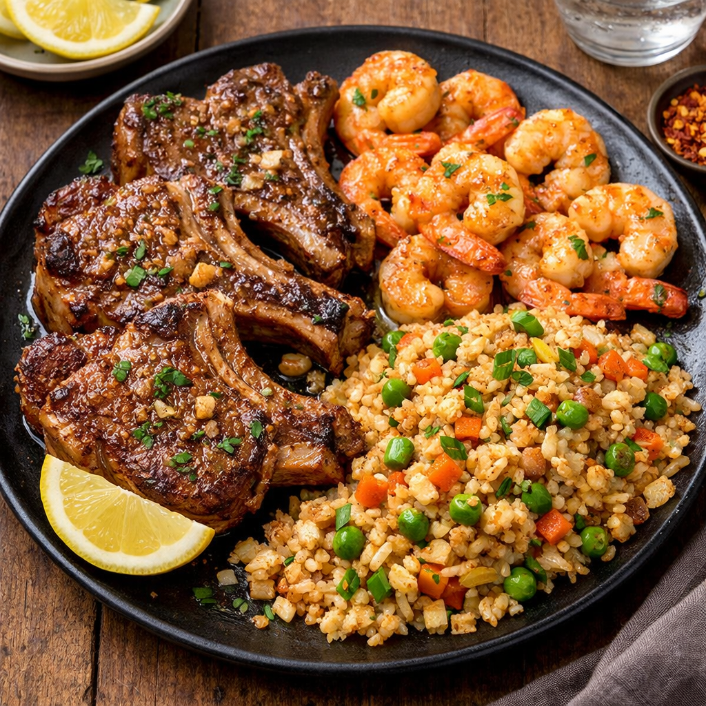 Garlic Butter Lamb Chops with Shrimp & Fried Rice is a bold, indulgent dish that brings together land and sea in one satisfying plate. Juicy, pan-seared lamb chops are cooked in rich garlic butter, paired with tender shrimp, and finished with fragrant fried rice made in the same pan to absorb all the savory flavors. This recipe feels restaurant-worthy yet comes together quickly, making it perfect for a special dinner or an elevated weeknight meal.