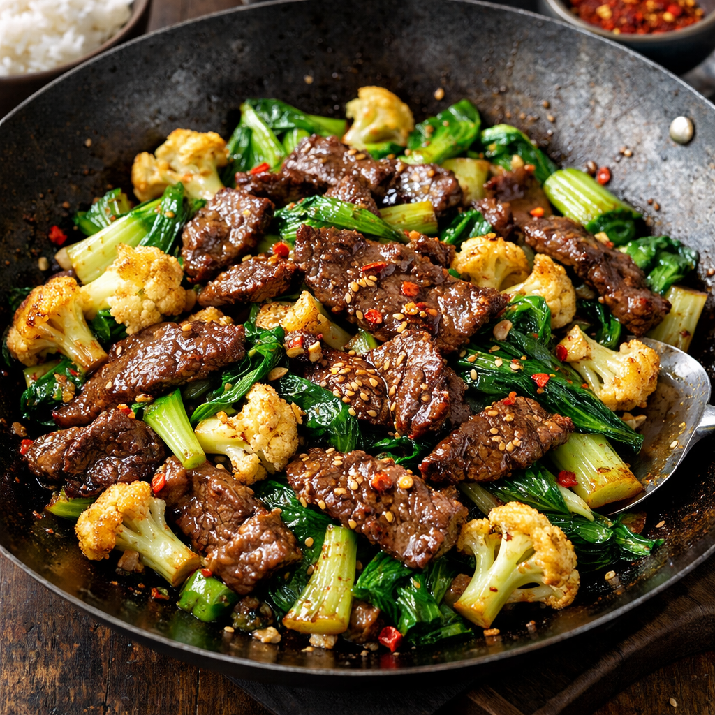 This savory wok-fried beef dish is a fast, flavorful meal inspired by classic Asian stir-fries. Tender slices of beef are seared over high heat, then tossed with crisp cauliflower and vibrant bok choy in a glossy soy-garlic sauce. The result is a perfectly balanced dish that’s rich, satisfying, and light enough for weeknights, yet bold enough to feel special. It’s naturally low in carbs, endlessly adaptable, and ready in under 30 minutes.