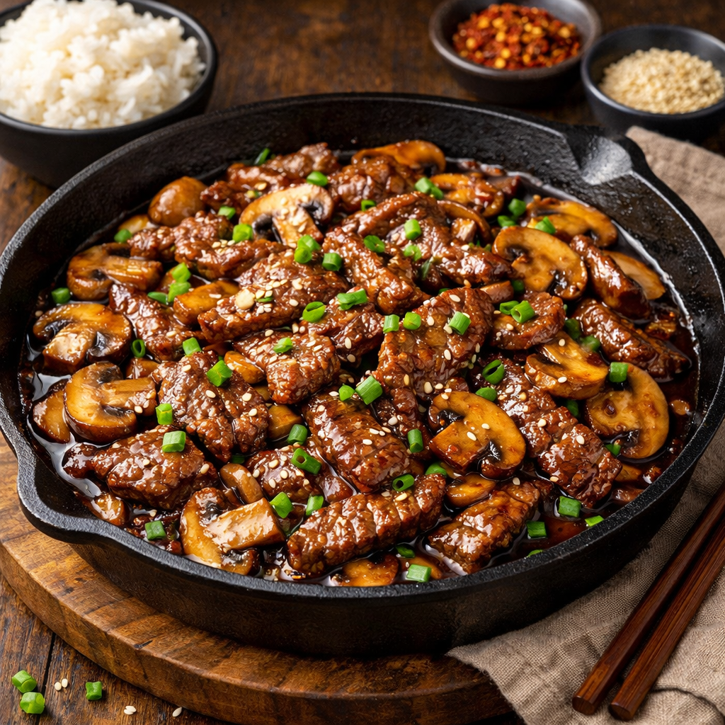 This Sizzling Skillet Beef and Mushrooms is fast, savory, and deeply satisfying. Tender slices of beef are seared until juicy, then tossed with caramelized mushrooms in a bold soy-garlic glaze finished with sesame oil. It’s a one-pan dinner that delivers steakhouse flavor with takeout-style speed.