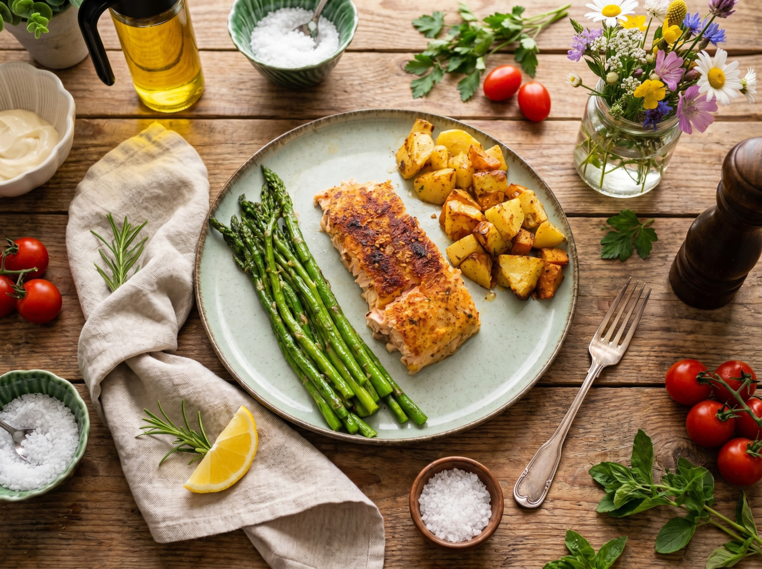 1. Plate the salmon with roasted potatoes and garlic asparagus.