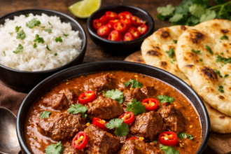 Slow-Cooked Spicy Coconut Beef Curry with Garlic Naan